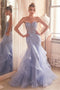 This Applique Fitted Satin Corset Slit Gown by Ladivine CD868 is a Prom dream come true with its sheer Dreamz and luxurious Ladivine Cinderella aesthetic. Be the talk of the night with this fitted gown, complete with intricate appliqué designs and a stunning slit.