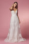 - Sleeveless deep illusion V-neck bodice secured with spaghetti straps