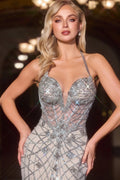 Make a statement in this stunning Ladivine CD716 halter gown, where intricate beadwork and geometric crystal details create an unforgettable sparkle. The illusion sweetheart neckline flows into a supportive halter design, while strategic corset boning defines your silhouette beautifully. A sheer, beaded bodice transitions into a fitted floor-length skirt with graceful train, all finished with a luminous tulle overlay that shimmers with movement. Perfect for prom, galas, pageants, or any occasion demanding elegance and drama. Sleeveless with open back and zipper closure. Fully lined with bra cup support. Available in silver/nude, sizes 0-16.