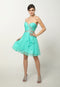 Light up the room in this beaded long cap sleeve dress with A-line skirt Juliet 636. This beautiful gown features a sheer sweetheart bodice, cap sleeves, enclosed illusion back, and a full length A-line skirt that ends in a sweep train.