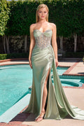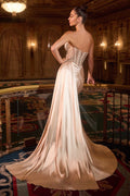 Elevate your formal wardrobe with the Ladivine KV1131, a stunning strapless gown that commands attention. This sophisticated design features a sweetheart neckline adorned with intricate crystal beading that shimmers with every movement, paired with a structured corset back for confident support. The luxurious satin skirt flows to the floor with an alluring leg slit and side sash, creating an effortlessly glamorous silhouette. Fully lined with a lace-up back and zipper closure, this gown delivers both comfort and elegance for prom, galas, black-tie events, and special occasions. Available in Champagne/Gold, Deep Red, Light Blue, and Sage Green in sizes 0-16.
