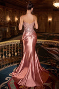 Step into the spotlight in this stunning Ladivine KV1132 strapless gown, where timeless elegance meets modern sophistication. Crafted from luxurious satin and adorned with shimmering crystal beads, this floor-length masterpiece features a sweetheart neckline, corset-boned bodice, and an alluring side slit that commands attention. The open back with zipper closure and pleated bust create a captivating silhouette, while the structured design ensures a flawless fit all evening long. Whether you're attending prom, a gala, or a red-carpet event, this versatile gown delivers the glamour and confidence you deserve. Available in five stunning colors and sizes 0-16.