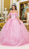 Introducing the Dancing Queen 1943 Elegant Quinceañera Ball Gown! This stunning champagne-colored dress features a sweetheart off-the-shoulder neckline, a corset bodice, and intricate lace embroidery. The sparkling glitter tulle ball gown skirt adds a touch of regal elegance. Be the belle of the ball with this exquisite and unique dress.