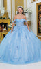 Exquisite blush pink quinceanera gown featuring dimensional floral accents, structured corset construction, elegantly draped off-shoulder detailing, intricate lace embroidery, and a voluminous glitter tulle skirt with ball gown silhouette.