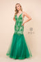 All eyes will be on you in this embroidered bodice long high halter trumpet dress by Nox Anabel A175.