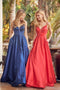 Be a trendsetter in this long sleeveless deep illusion v-neck dress with A-line skirt by Juliet 270. This eye-catching dress is embroidered with stones bodice and lace up back with adjustable strap and zipper closure.