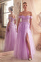 Make a grand entrance in Ladivine by Cinderella Divine's C150: a sleeveless corset dress adorned with embroidered lace applique and complete with an A-line slit skirt. Indulge in a fairytale-like experience as you don this romantic lace and tulle ball gown. The beautiful A-line silhouette showcases a sheer bodice adorned with delicate lace details, adding an ethereal element. Thin straps accompany the low back, which is finished with a charming lace up corset closure. The glitter tulle skirt cascades gracefully, ending in a lovely leg slit for easy movement - perfect for dancing the night away.