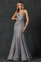Captivate the room in this long sleeveless open back dress with fitted mermaid skirt by Juliet 271. This shimmering dress comes with glitter mesh v-neckline and zipper closure with sweep train.