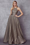 Be selfie ready in this long sleeveless cutout dress with fitted mermaid skirt with sweep train by Juliet 239. The ball gown comes with illusion v-neck and sides, adorned with a jeweled beaded waist with lace-up back with adjustable ties and zipper closure.