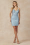 Enchant the crowd with this sequin print V-neck bodycon dress from Juliet 874. Its fitted short skirt and sleeveless illusion bodice create a corset-like silhouette. It features a zipper closure at the back and is fully lined with a bra cup. The dress comes in a variety of colors and sizes for any formal or special occasion, from X-Small to 2X-Large. Colors available include Purple, Black, Emerald Green, Rose Gold Pink, Red, and Royal Blue. Perfect for homecoming, prom, a wedding guest, graduations, or the Marine/Military ball.