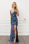 Be the center of attention in this fitted iridescent sequin gown with lace-up corset back by Nox Anabel S458. This matte chiffon V-neck dress is beautifully embellished with sequined lace appliques.