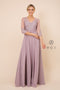 Receive lots of compliments in this long fitted V-neck dress with beaded sheer cape by Nox Anabel Y531.