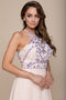 Look feminine and chic in this long open back dress with red floral embroidered bodice by Nox Anabel 8275. This long evening gown features a high-neck sleeveless illusion bodice with beautiful red floral embroidery, flirty open back, satin waist belt, full length skirt that elegantly flows to the floor, and a zipper closure. Perfect for any formal event!