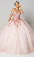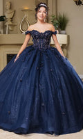 Step into enchantment with the May Queen LK278, where romantic sophistication meets show-stopping glamour. This exquisite ballgown features an alluring sweetheart neckline framed by delicate off-shoulder sleeves that exude elegance. The fitted bodice dazzles with intricate sequin detailing and dimensional floral appliques, creating a mesmerizing focal point. A voluminous ballgown skirt cascades gracefully into a sweeping train, while an oversized back bow adds a dramatic finishing touch that commands attention. Perfect for proms, galas, and unforgettable celebrations, this gown transforms you into the vision you've always imagined. Available in stunning Navy and Rosegold.