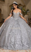 Radiate timeless elegance in the May Queen LK283, where romantic details meet show-stopping glamour. The off-shoulder design and plunging V-neckline create an alluring silhouette, while the sheer corset bodice dazzles with intricate beadwork and delicate floral appliqués. Voluminous ballgown layers adorned with ornamental lace trim and glittering embellishments cascade into a breathtaking chapel train. The adjustable lace-up back provides a customized fit that prioritizes both comfort and refined style. Every exquisite detail transforms this gown into a wearable masterpiece, perfect for those who demand sophistication with unforgettable impact. Available in Dustyblue and Sterling.