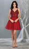 May Queen MQ1417: A stunning cocktail dress with a sleeveless gold-embroidered fitted bodice and an A-line skirt. The dress has a short length, a V-neckline, and a natural waistline.