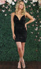 May Queen MQ1692: A fascinating short dress adorned with lace appliques, rhinestone ornate embroideries, and a plunging V-neckline with a sheer inset. The A-line skirt has layered details and a curling short hem. Suitable for various occasions.