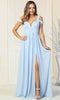 May Queen MQ1820: This alluring dress has a sheath silhouette with a sleeveless V-neckline and spaghetti straps. It has a low-cut open back with lace-up support and a ravishing high leg slit. The dress is designed to make a statement.