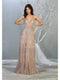 May Queen MQ1824: Make a dazzling entrance in this off-shoulder gown with glitter accents. The fitted bodice leads to a sheath silhouette and a full-length hemline with a sweep train. Stand out and leave a lasting impression in this stunning May Queen creation.