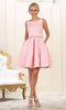 May Queen RQ7604: A sophisticated cocktail dress featuring a bateau neckline, princess seams, an embellished belt, a high-low A-line skirt, a diamond cutout back, and a back zipper closure. The dress has a high-low length and a natural waistline.