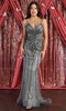 Get ready to captivate everyone in the May Queen RQ7881 gown. This eye-catching dress features unique bead and stone embellishments on tulle fabric. It has a plunging V neckline, side cutouts with a mesh inset, a sheath silhouette with a front thigh-high leg slit, and a sweep train. Channel your inner princess and turn heads in this stunning design. The dress is available in Champagne and White colors.