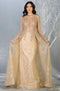 May Queen RQ7884: Have a blast in this fashionable evening gown. It showcases a fitted bodice with floral appliques, a plunging V-neckline with a mesh inset, an open back, and a sheath silhouette with a thigh-high leg slit and a dramatic sweep train.