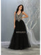 May Queen RQ7918: A luxurious evening gown with floral appliques on the corset-style bodice. It has a sleeveless plunging V-neckline, illusion sides, and a trumpet skirt with a horsehair hemline.