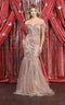 Enjoy your next special party or event in the sassy and stylish May Queen RQ7934 dress. It features a V-neck supported by straps, side cutouts with a mesh inset, and a fully embellished sequin and bead fish-scale design. This dress is designed to make a special occasion worth reminiscing about. The model is wearing the Champagne color.