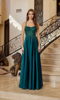 The Nox Anabel A1725 is an effortlessly elegant formal dress with a sheer fitted bodice intricately adorned with sparkling sequin embellishments and appliques and a full-length draped satin a-line skirt. This timeless dress features a scoop neckline and spaghetti straps that crisscross into the adjustable lace-up open back.