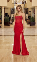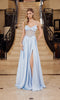 Strapless floor-length prom dress by Nox Anabel with a form-fitting silhouette. This dress features a rhinestone-embellished and beaded fitted bodice with a straight neckline, a midrise open back with a zipper closure, and a shimmering stretch-satin skirt with gathering at the waistline and a daring high-leg slit.