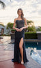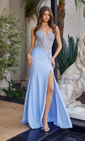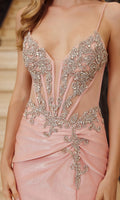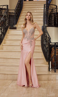 Sleeveless prom dress by Nox Anabel with a sheer beaded-embellished corset bodice and a floor-length satin skirt with a thigh-high slit. This dress features delicate spaghetti straps, a sheer deep v-neckline, an open back detail with strap closure, and a gracefully sweep train.