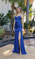 Stretch satin sleeveless prom dress by Nox Anabel featuring a fitted bodice with a draped neckline and thin shoulder straps. The dress has an adjustable lace-up open back for a customizable fit and a floor-length skirt with a high-leg slit for ease of movement. Ruching and gathering at the waist line and lower back flatters the figure for an overall elegant look.
