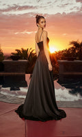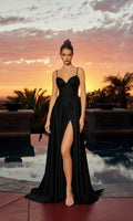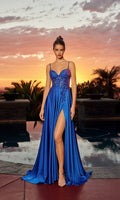 Classic elegant sleeveless dress by Nox Anabel featuring a fitted embroidered corset-style bodice with thin shoulder straps, a sweetheart neckline, and a midrise open back with a zipper closure. The dress transitions to stretch satin full-length a-line skirt with a high-leg slit for ease of movement.