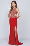 Sparkle from every angle in this sequined long halter dress with mermaid skirt by Juliet 683. This dress has a halter V-neck with sparkling hand-stitched sequined bodice with an open leg slit that will surely make a grand entrance.