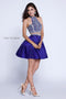 Grab everyone's attention in this two-piece sleeveless lace bodice crop top cocktail dress by Nox Anabel Style Number 6275. This short party dress features a high-neck sleeveless crop-top bodice adorned with beautiful sequined lace appliques, V-shape back, beaded waistband, short taffeta skirt, and a zipper closure. Perfect for any semi-formal event!