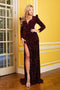 Achieve a sophisticated look with this velvet off-shoulder dress by Adora 3120. Featuring a sweetheart bodice, long sleeves, and open back with zipper closure, and a floor-length fitted skirt with a side leg slit and sweep train, this gown is perfect for any formal occasion. Available in black, dark emerald green, and burgundy, and in sizes X-Small to 3X-Large.