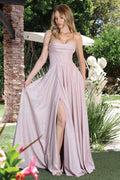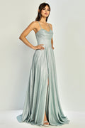This is a long evening gown designed for formal events where structure and ease of movement both matter. The bodice is fitted and softly draped to support the bust and define the waist. Slim shoulder straps help keep the neckline stable and comfortable. The skirt flows from the waist into a full shape that moves easily when walking or standing. A front slit allows more freedom of movement without disrupting the overall line. The fabric has a smooth finish that drapes cleanly and feels lightweight. The gown is lined to improve comfort and coverage. The back features a lace up detail that allows small fit adjustments. This style works well if you want waist definition with a balanced, flowing skirt.