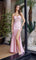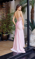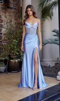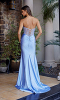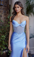 Strapless floor-length prom dress by Nox Anabel made of luxurious shiny satin fabric. This dress features a sheer fitted corset bodice with vertical lines of beaded embellishments, a sweetheart neckline, pleating at the bust, and a sheer back with an adjustable lace-up. The satin skirt features gathering at the natural waistline and a daring high-leg slit.