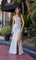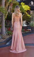 Strapless long prom dress by Nox Anabel featuring a fitted sparkling rhinestone-embellished corset bodice and a stretch-satin fitted sheath skirt with gathering at the natural waist. This dress features a scoop neckline, satin pleating at the bust, a midrise open back with a zipper closure, and a high-leg slit.