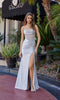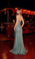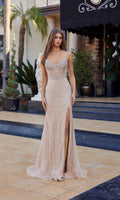 The Nox Anabel A174 is a fully crystal and beaded embellished sleeveless prom dress with a flattering silhouette. This design features a fitted crystal-embellished corset bodice with a sheer deep v-neckline, delicate spaghetti straps, and an adjustable lace-up open back. The fitted sheath skirt with a high-leg slit is adorned with vertical lines of beaded embellishments from the waistline to the hem and flows gracefully to the floor into a soft sweep train for a statement look.