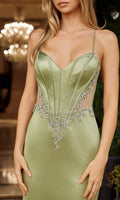 Sleek stretch satin sleeveless prom dress by Nox Anabel. This dress features delicate beaded spaghetti straps that crisscross into the strappy adjustable lace-up open back. The structured corset bodice of this dress is adorned with rhinestone and beaded embellishments and has a sweetheart neckline and sheer sides. The smooth sheath skirt has a thigh-high slit and flows gracefully into a subtle sweep train.