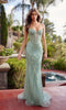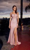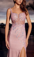 Rose-pink shimmering sleeveless prom dress by Nox Anabel. This dress features a sheer fitted corset bodice and waist with floral embroidery, floral applique shoulder straps, and an adjustable lace-up open back. The fitted sheath stretch jersey glitter skirt has a high-leg slit and flows effortlessly to the floor into a subtle sweep train for a glamourous look.
