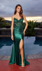 Strapless caramel-gold prom dress by Nox Anabel featuring an embellished sheer fitted corset bodice and a floor-length fitted sheath skirt made of smooth shiny satin fabric. This design features a sweetheart neckline, intricate crystal beading on the front bodice, a sheer open back with a zipper closure, gathering at the natural waistline, and a high-leg side slit.
