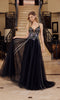 Strapless nude floor-length prom dress by Nox Anabel with beautiful intricate beadwork and scattered sequins across the full fitted sheath silhouette. This dress features a sheer crystal-embellished corset bodice, a midrise open back with a zipper closure, and a dramatic high-leg slit on the fully beaded skirt.