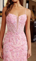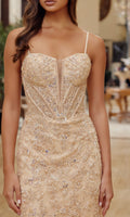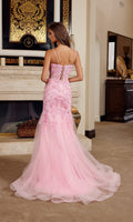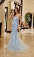 Floor-length sleeveless prom dress by Nox Anabel with a figure-flattering trumpet silhouette made from tulle fabric. This design features intricate beaded sequin-embroidery and delicate floral appliques that cascade down from the neckline to the bodice and skirt. The sheer fitted bodice is supported by spaghetti straps and has an illusion low v-neckline and an adjustable lace-up open back. The dress finishes with a beautiful tulle sweep train for a breathtaking look.