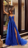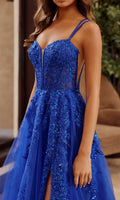 Sleeveless long prom dress by Nox Anabel fully adorned with detailed embroidery and scattered sequins and beadwork. This design features a fitted corset bodice with a sheer deep v-neckline, sheer sides, thin shoulder straps, and a crisscross strappy adjustable lace-up open back detail. The full-length tulle shimmering a-line skirt features a thigh-high slit and flows gracefully into a sweep train for a classic and elegant look.