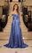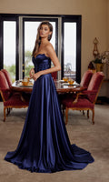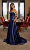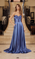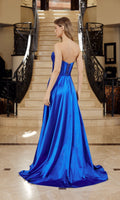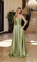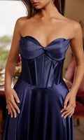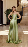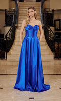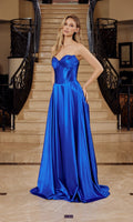 Strapless satin floor-length formal dress by Nox Anabel featuring a fitted corset bodice with a sweetheart neckline, a twisted pleated detail at the bust, and a midrise open back with an adjustable lace-up. The dress transitions into a flowy full-length draped a-line skirt with hidden pockets and a sweep train.