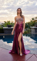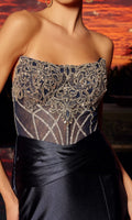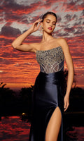 The Nox Anabel L1771 is an elegant strapless formal dress designed to make a statement. This dress features a fitted bodice adorned with unique intricate beadwork patterns and a midrise open back with a zipper closure. The smooth floor-length satin skirt with a luxurious texture features a beautiful crisscross pleating detail at the natural waistline, a dramatic high-leg slit, and a graceful sweep train.