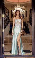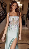 Beautiful sleeveless long prom dress by Nox Anabel with embroidered 3D floral appliques on the sheer fitted bodice and waist and a sleek floor-length satin skirt. This design features floral-appliqued shoulder straps, a straight neckline, an adjustable lace-up open back, a daring high-leg slit and a graceful sweep train.