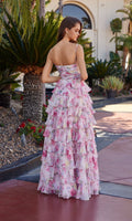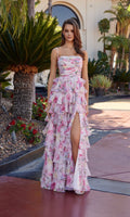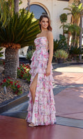 Floral-printed chiffon prom dress by Nox Anabel featuring a fitted ruched bodice with delicate thin shoulder straps, a midrise open back with a zipper closure, and a full-length layered ruffle flowy a-line skirt with a thigh-high slit.
